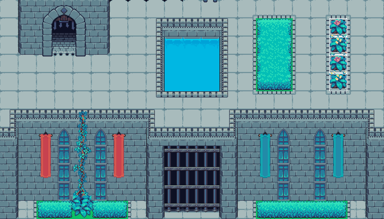 320 tiles worth of pixels for building a timeless kingdom of classic top-down adventure! Start your next project with a solid foundation for building an overworld with a little bit of a nod to the classics. Tiles are 32x32, and most materials are limited to a palette of 5 or 6 colors, in addition to a single global outline color.